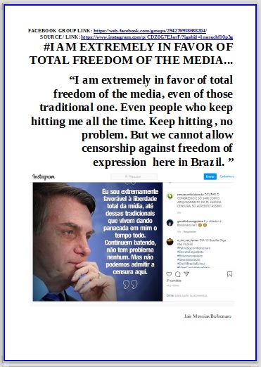 “I am extremely in favor of total freedom of the media, even of those traditional one. Even people who keep hitting me all the time. Keep hitting , no problem. But we cannot allow censorship against freedom of expression here in Brazil. ”